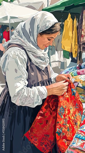 © Hungarian, Fototapeta premium Woman at Market Examining Vibrant Fabric