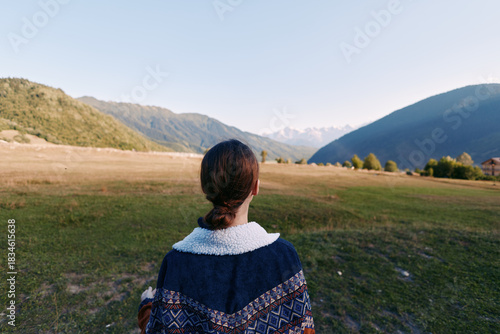 Fototapeta premium Woman back landscape mountains meadow sweater viewed from behind in peaceful...