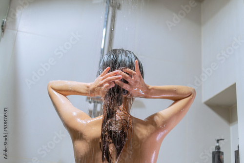 © torwaiphoto, Naklejka premium Woman bathing and washing her hair relaxed..