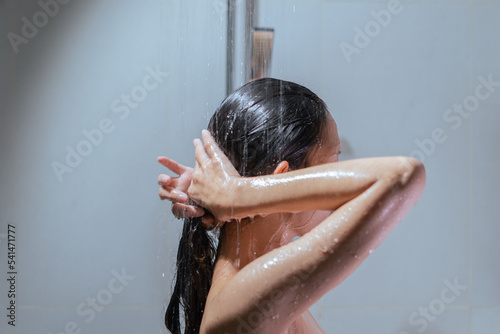 © torwaiphoto, Naklejka premium Woman bathing and washing her hair relaxed..