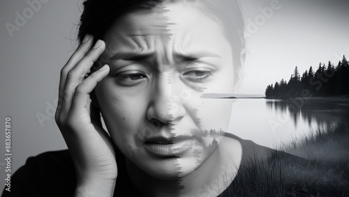 Obraz premium Woman Battling Inner Turmoil with Nature Landscape Overlay