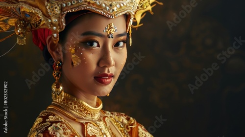© anis rohayati, Fototapeta premium Woman Beautiful model with regional cultural make-up and gold ornaments on her head AI generated image
