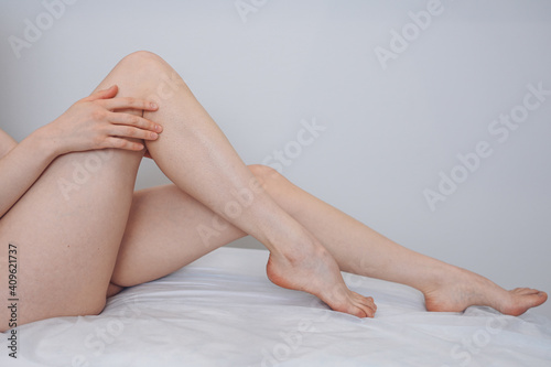 © Алина Троева, Fototapeta premium Woman body care. Close up of long female tanned legs with perfect smooth soft skin, pedicure, healthy nails on white medical couch and background. Epilation, beauty and health concept.
