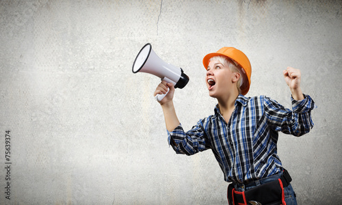 Fototapeta premium Woman builder with megaphone
