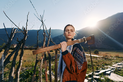 © SHOTPRIME STUDIO, Obraz premium Woman carrying an axe on her shoulder in countryside near a rustic fence with mountains and sunrise in background, wearing a patterned sweater and looking confident.