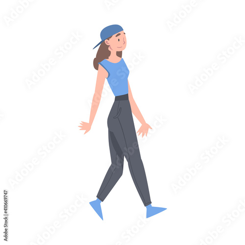 Fototapeta premium Woman Character Wearing Baseball Cap Going or Walking Taking Steps Forward Side View Vector Illustration