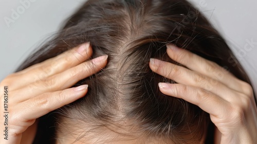 © AriyaniAI, Naklejka premium Woman Checking for Hair Loss or Thinning