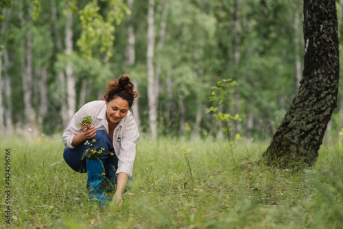 © Irina_Evva, Obraz premium Woman collecting wild berries and plants in forest on summer day. Female enjoying leisure, healthy eating and natural lifestyle outdoors