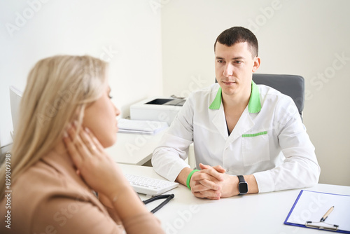 © Svitlana, Fototapeta premium Woman complaining of cervicalgia to neurologist during initial consultation