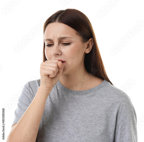 Fototapeta premium Woman coughing on white background. Cold symptom
