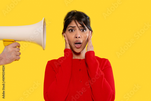 Naklejka premium Woman covers ears in surprise as loudspeaker is directed towards her against...