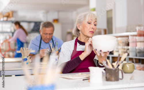 Obraz premium woman covers with white paint almost ready-made jug, which she made herself at pottery workshop