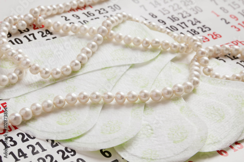 Fototapeta premium Woman critical days, menstrual period, pad, napkin, cotton tampons, sanitary pads, critical days, menstrual cycle, Menstruation calendar, flower.