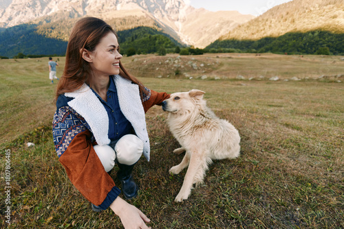 Fototapeta premium Woman crouching in a mountain field smiling while petting a dog, enjoying nature and companionship in a scenic outdoor landscape, casual jacket, happy moment with her pet
