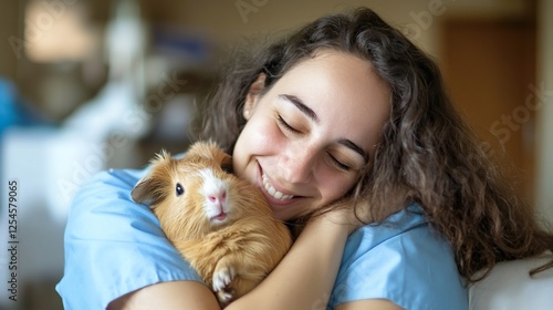 © Fi, Fototapeta premium Woman cuddling guinea pig, home interior