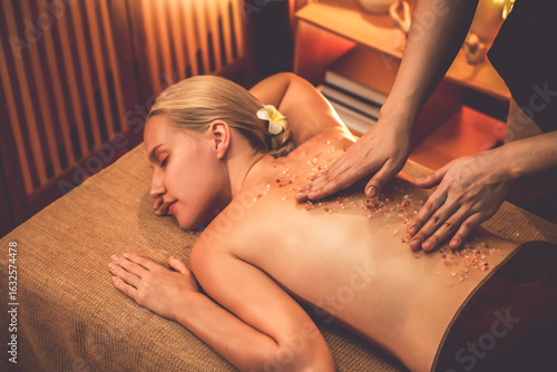 Fototapeta premium Woman customer having exfoliation treatment in luxury spa salon with warmth candle light ambient. Salt scrub beauty treatment in Health spa body scrub. Quiescent
