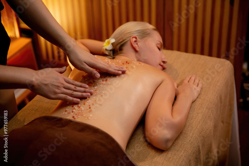 Fototapeta premium Woman customer having exfoliation treatment in luxury spa salon with warmth candle light ambient. Salt scrub beauty treatment in Health spa body scrub. Quiescent