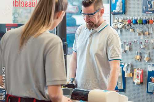 © Kzenon, Obraz premium Woman customer talking to keymaker or locksmith