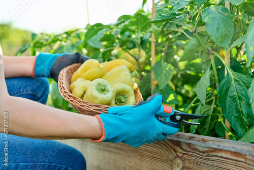 Obraz premium Woman cutting ripe yellow sweet bell peppers into basket from garden