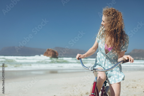 Naklejka premium Woman cycling along pale sandy shoreline with red bicycle near rock outcrop...