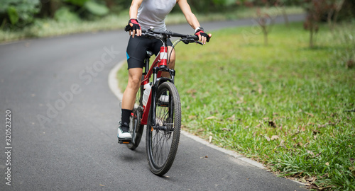 © lzf, Obraz premium Woman cyclist riding mountain bike in park