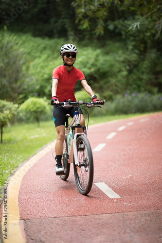 Obraz premium Woman cyclist riding mountain bike outdoors