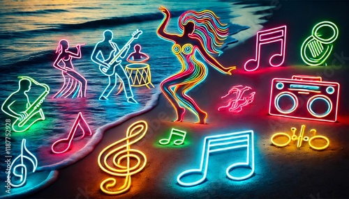 Naklejka premium woman dance beach palm tree sunset silhouette neon lines tropical vibes sand...