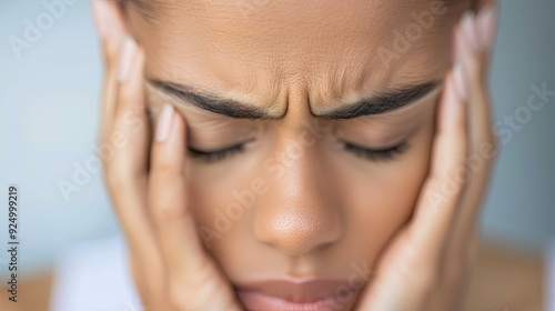 © Настя Олейничук, Fototapeta premium Woman Deep in Thought with Puckered Lips and Blurred Background
