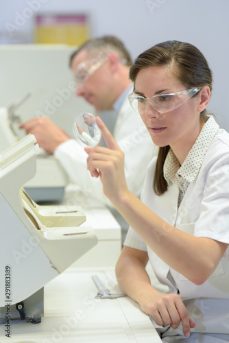 Fototapeta premium woman doctor holding magnifying glass in lab