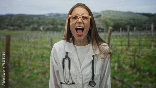 © Krakenimages.com, Fototapeta premium Woman doctor in white coat wearing stethoscope and glasses, mouth wide open shouting in vineyard field outdoors; alarm.