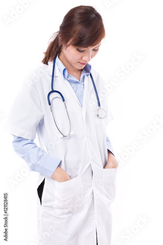 © 9nong, Fototapeta premium woman doctor looking down, studio isolated