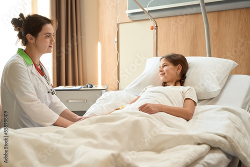 © Svitlana, Obraz premium Woman doctor sits at the bedside of a recovering girl