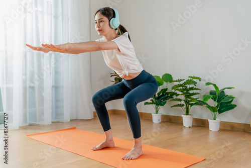 © Chayjitti, Fototapeta premium woman doing exercise yoga plank at home.