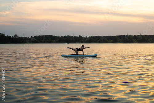 © Marharyta, Naklejka premium woman doing yoga on sup board at sunset. outdoor summer activity. Sup yoga. Social Distancing. copy space. Mental Health