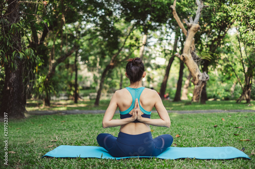 © Nattakorn, Fototapeta premium Woman doing yoga pose/meditation at outdoor green park/garden with happy feeling in the morning