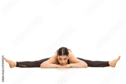 © Jasmina, Fototapeta premium Woman doing yoga side splits on white background