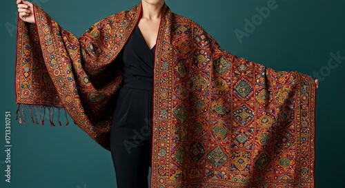 © Muhamat, Fototapeta premium Woman draped in vibrant, intricately patterned Kashmiri shawl against teal backdrop.