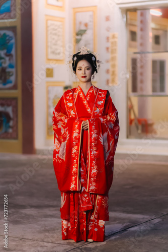 © Tanarat, Fototapeta premium Woman dress China New year. portrait of a woman. person in traditional costume. woman in traditional costume. Beautiful young woman in a bright red dress and a crown of Chinese Queen posing.