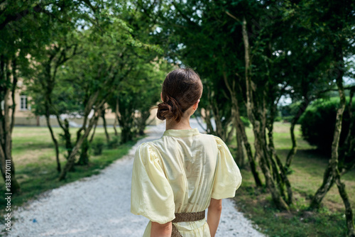 Fototapeta premium Woman dress walking back park pathway summer nature bun elegant authenticity...