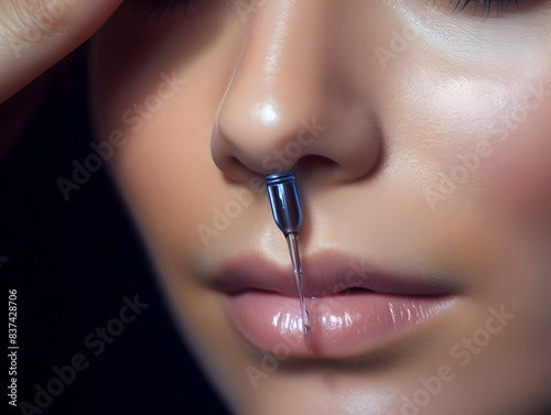 © Akilmazumder, Obraz premium Woman Dropping Serum on Face. Women's Skin and beauty care, Girl Applying Serum Collagen Moisturizer from Pipette on Face close up. Positive Laughing Beauty Woman Portrait. Concept of Skin Care