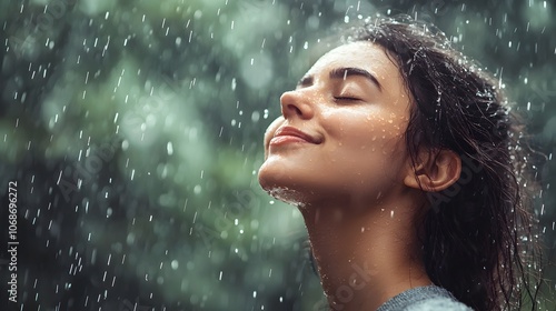 Obraz premium Woman Embracing the Rain with a Peaceful Smile Symbolizing Serenity and...