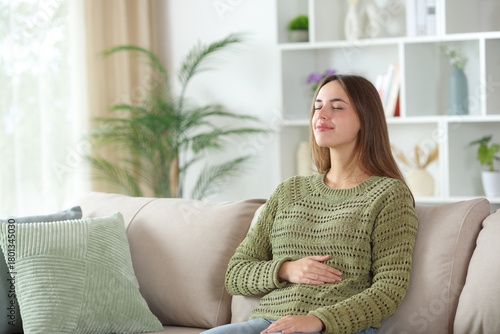 © Antonioguillem, Obraz premium Woman enjoying a healthy bowel tract at home