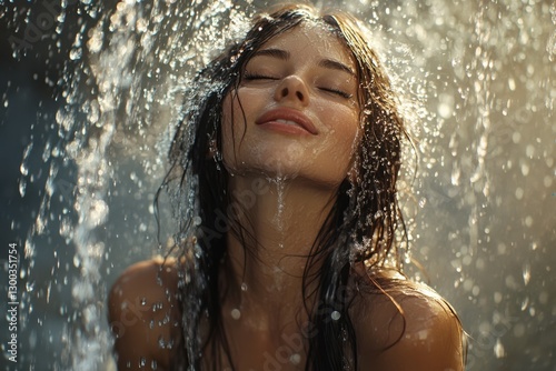 Fototapeta premium Woman enjoying a refreshing shower under sunlight in a serene atmosphere