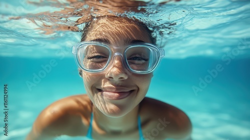 © GreatStockPics, Naklejka premium Woman enjoying a refreshing swim while smiling underwater at a sunny beach