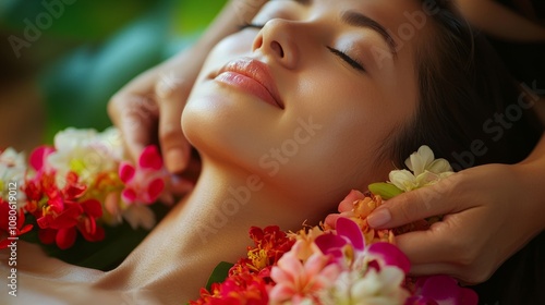 Fototapeta premium Woman enjoying a relaxing spa treatment with flowers in a tropical setting...