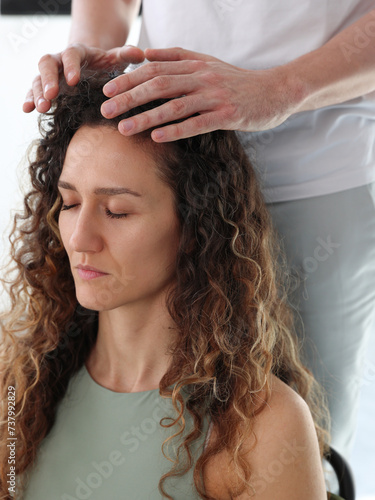 Naklejka premium Woman enjoying Energy Healing Reiki Treatment . Chakra Balancing, Aura...