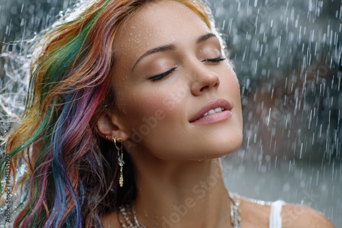 Fototapeta premium Woman enjoying rain outdoors with colorful hair and serene expression