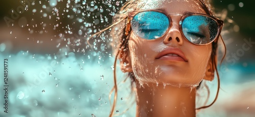 Naklejka premium Woman enjoying summer sun with sunglasses and water droplets on her face,...