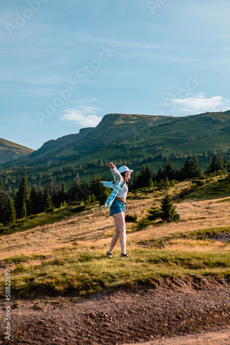 © phpetrunina14, Naklejka premium woman enjoying sunset above the mountains