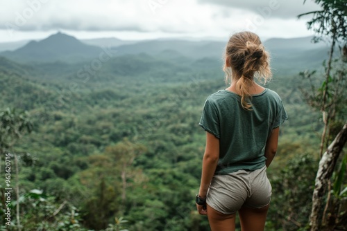 © BrandwayArt, Naklejka premium Woman enjoys a breathtaking forest view from a mountaintop on a cloudy day